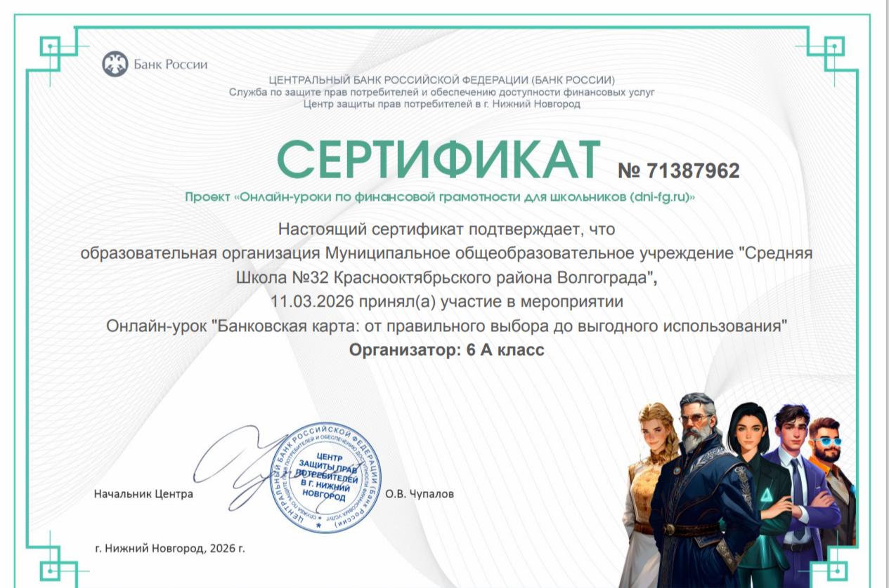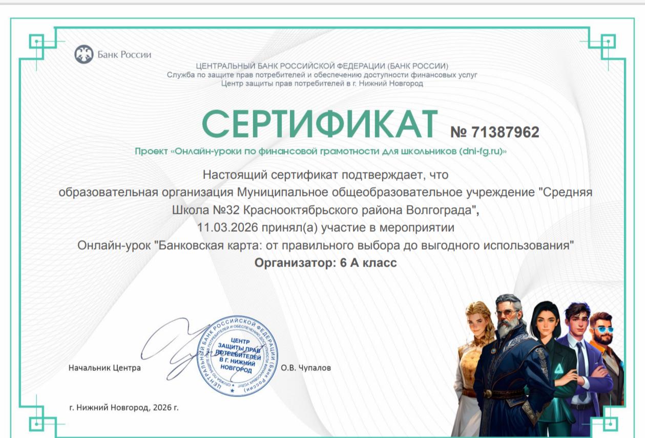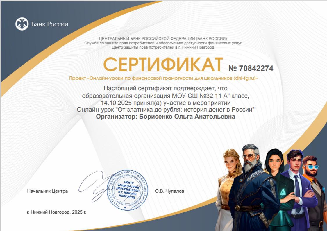 Сертификаты участников Уроков финансовой грамотности от Банка РФ