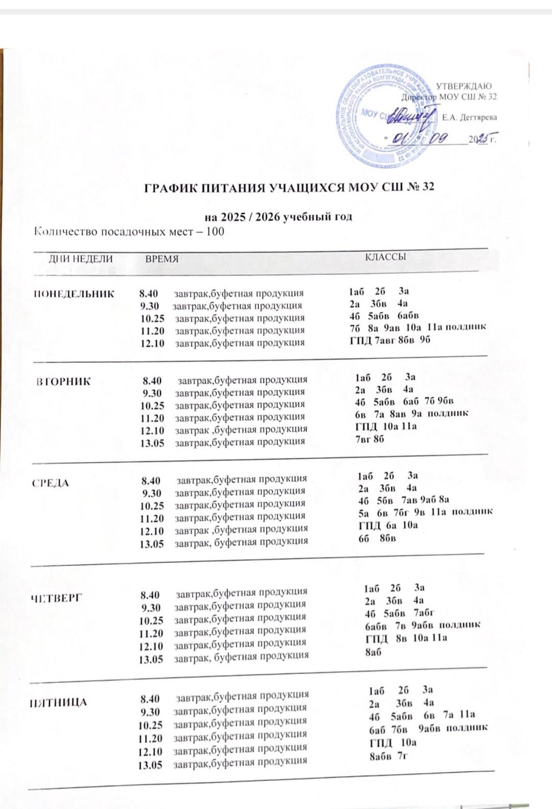 График приема пищи в столовой 2025-2026 учебный год